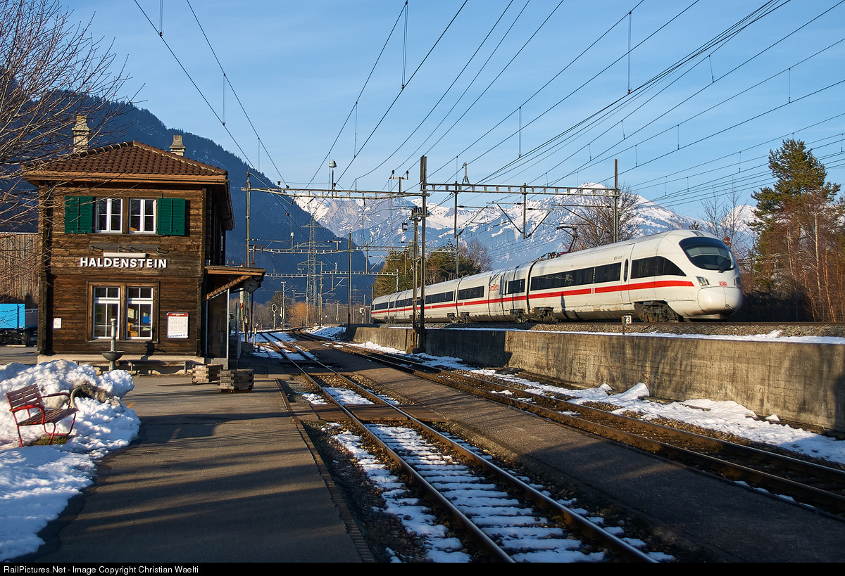 | ICE-T trainset No. 1580 "Darmstadt" running as ICE train 183 from Stuttgart Hbf to Chur via Schaffhausen - Winterthur - Zürich HB (Museumsstrasse) - Zürich Altstetten (changing direction) - Thalwil - Ziegelbrücke - Chur. Train 183‘s extension from Zürich HB to Chur was a seasonal Saturday only operation. The train is about to pass the Rhaetian Railway (RhB) narrow gauge Station of Haldenstein. |