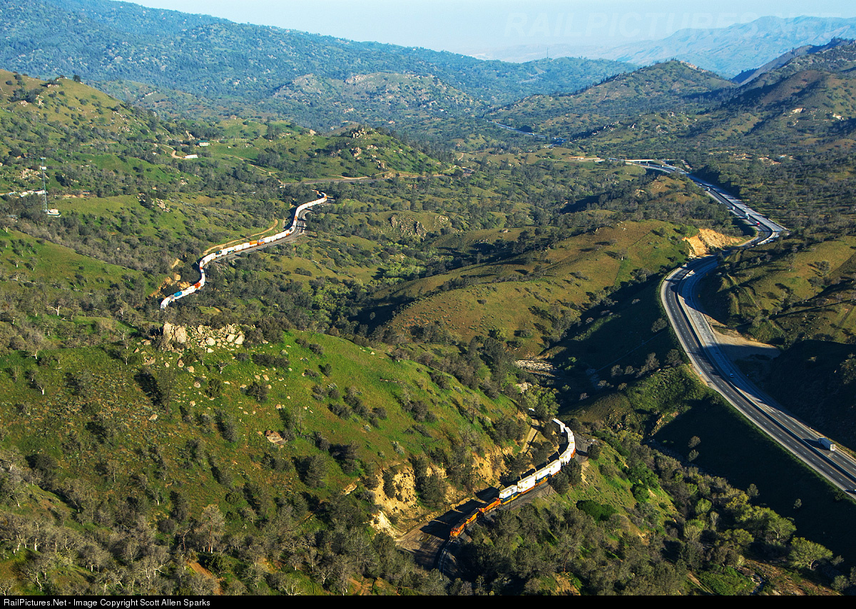 | Echoing GE locomotives, from a very long BNSF stack train, roar through the green hills of Tehachapi climbing the grade in early morning light, above the Tehachapi loop at Marcel. The upper elevations of the mountain are rich with emerald that creates a great contrast with the white containers on the train.