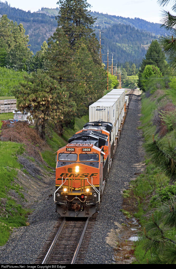 | Three months after shooting BNSF 7086 westbound in the snow, BNSF 3808 leads an eastbound Denver/Texas bound Q train through the same cut in lush spring conditions. The line is surrounded by orchards as the train traverses the 20 miles down the Wenatchee River Valley to Wenatchee, WA for its crew change. |