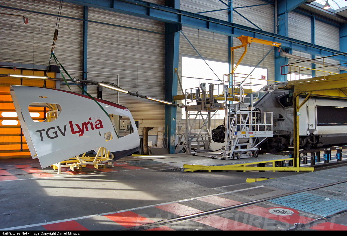 Villeneuve Saint Georges maintenance shop where high speed trainsets are inspected and repaired. On left, fibreglass nose of Lyria TGV #4416 is repaired after a collision with wildfowl and prepared to be re-integrate on the engine (on right). You can see the engine empty nose and technical details of this Lyria TGV #4416 on RPN #637414.