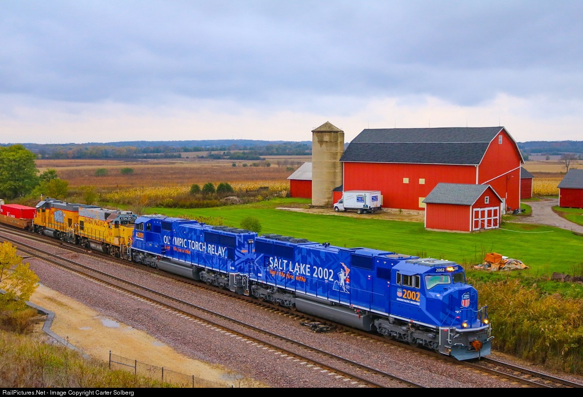 Union Pacific's Olympic Torch Relay units lead I-G2G2 past the red barn in La Fox Illinois.