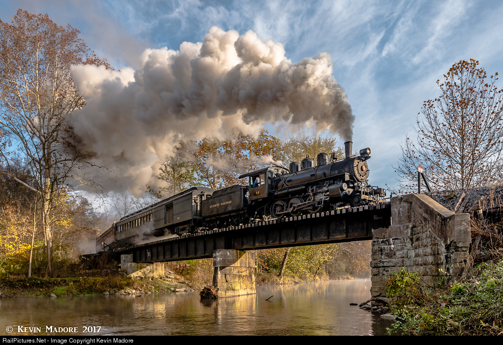 A chilly morning in Hollidaysburg. The morning sun highlights the impressive plume from the Everett Railroad's Alco #11 as she rumbles across the Frankstown Branch of the Juniata River at Milepost 10, with a passenger excursion bound for Brooks Mill and Roaring Spring. Although the sun has been up for about an hour, my hands are still telling me I should have brought gloves as the temperature still hovers around freezing. Check out the mist still rising from the comparatively warm waters beneath and beyond the bridge.