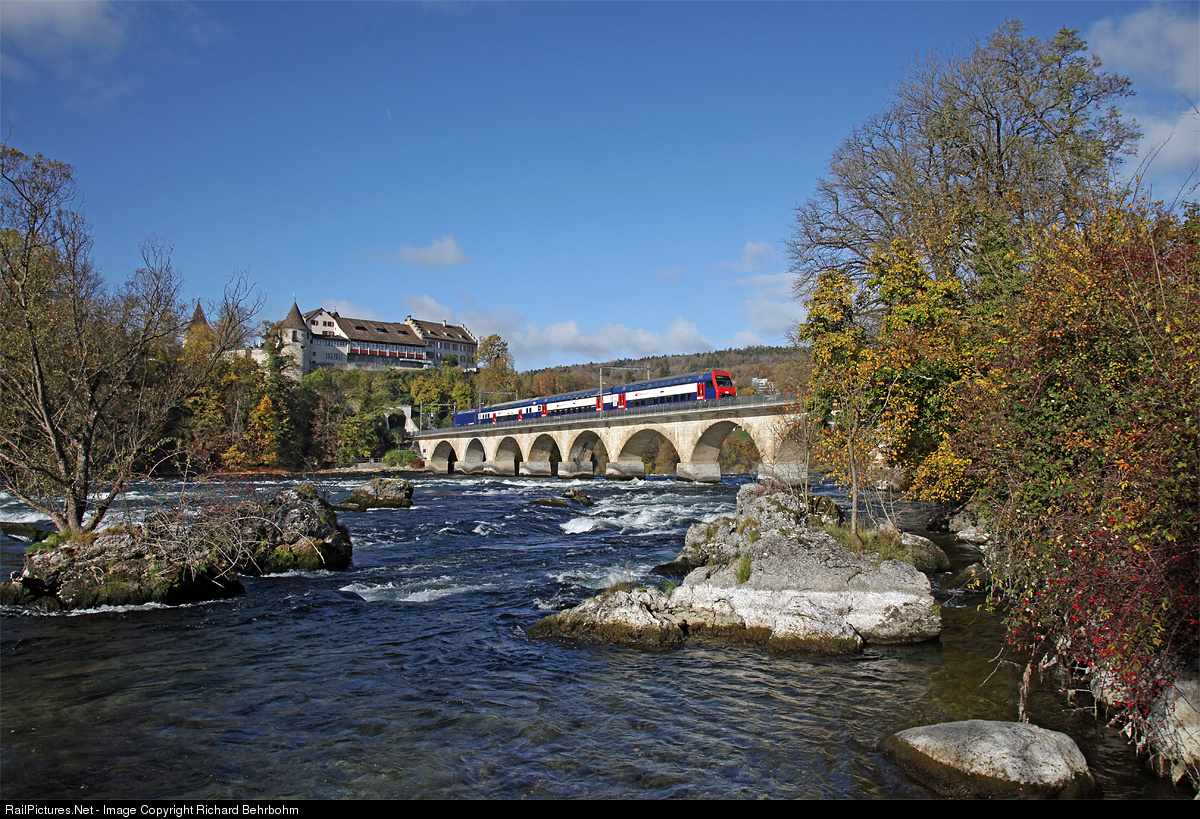 | Fall colors at the Rhine Falls: A double deck commuter trainset (DPZ) S 24 service Thayngen - Zug is crossing the bridge above the falls. |