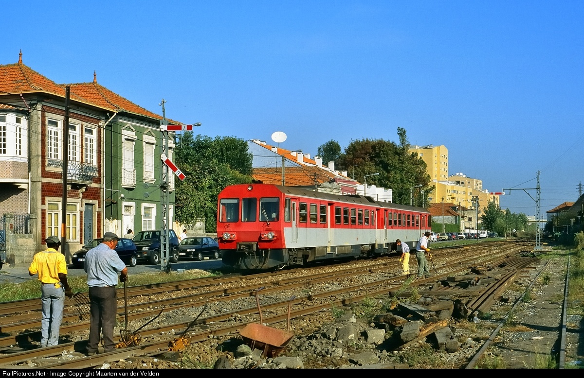 | A CP Alsthom DMU passes some railroad workers at Senhora de Hora on its way as Regional 5011 from Porto Trindade to Santo Tirso. Nowadays Metro do Porto serves the place with EMU's on standard gauge.