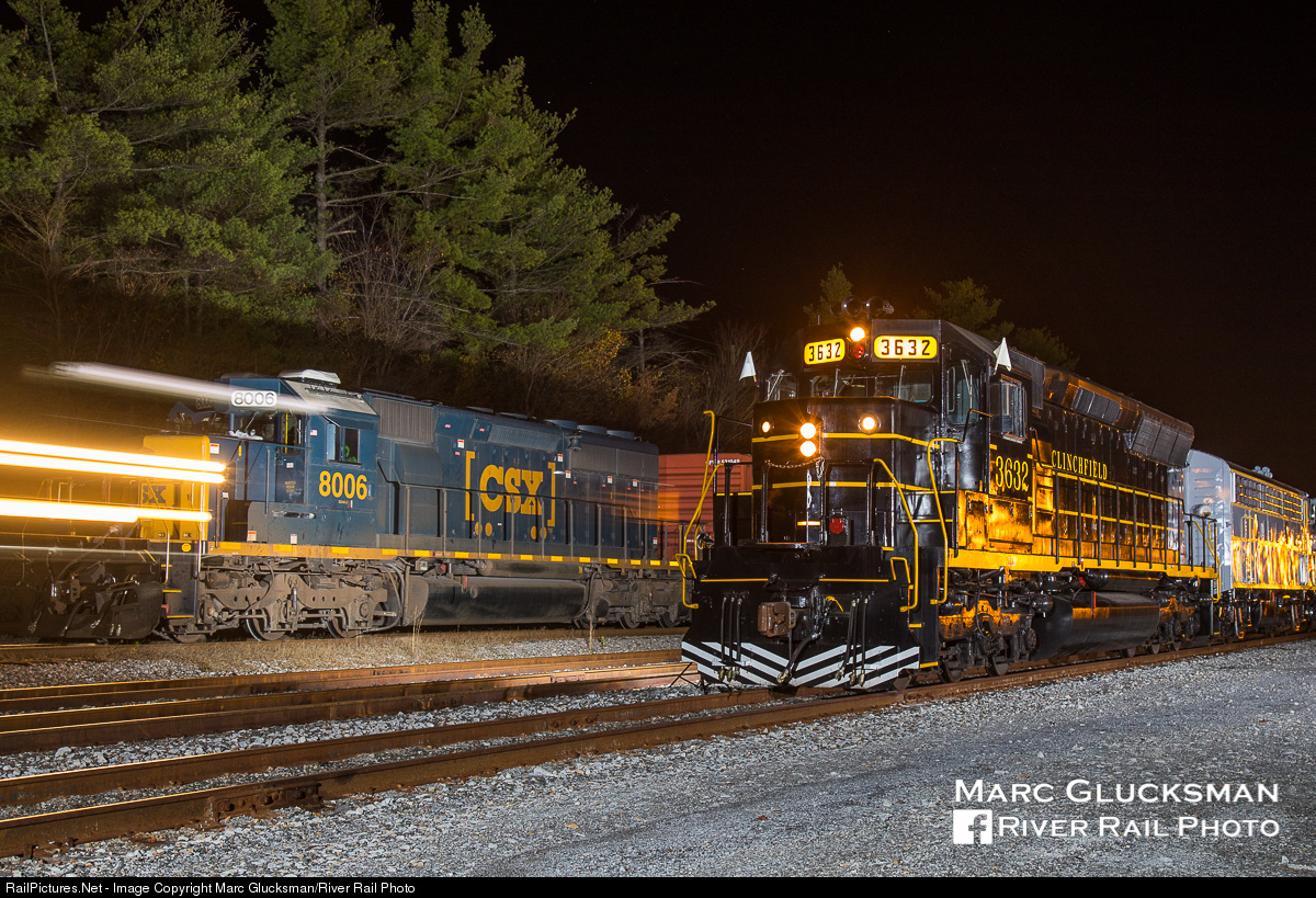| Unexpected visitor. CSX 8006 (SD40-2) passes Clinchfield Railroad 3632 (SD45) while capturing night shots of the Clinchfield engines that were restored in honor of the 75th Anniversary of The Santa Train. |
