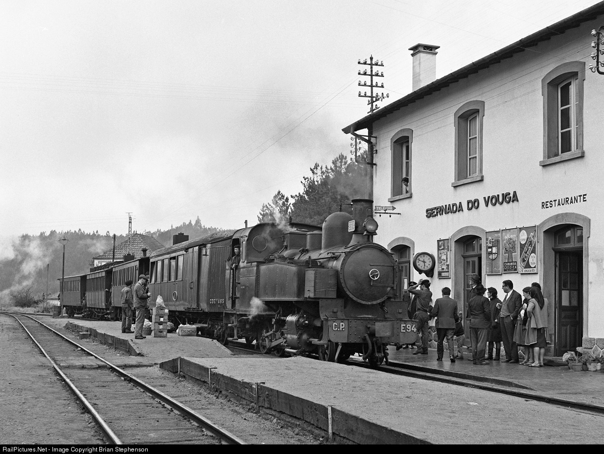 | CP metre gauge 2-6-0T No E94 arrives at Sernada do Vouga with the 16.30 train from Viseu. This was one of Seven Decauville type locos built for the CF Vale do Vouga railway in 1910-13. Becoming CP Nos E91 to E97. Only two were actually built by the French company, E 93 and E95, the remainder being built under license by Orenstein and Koppel in Germany. |