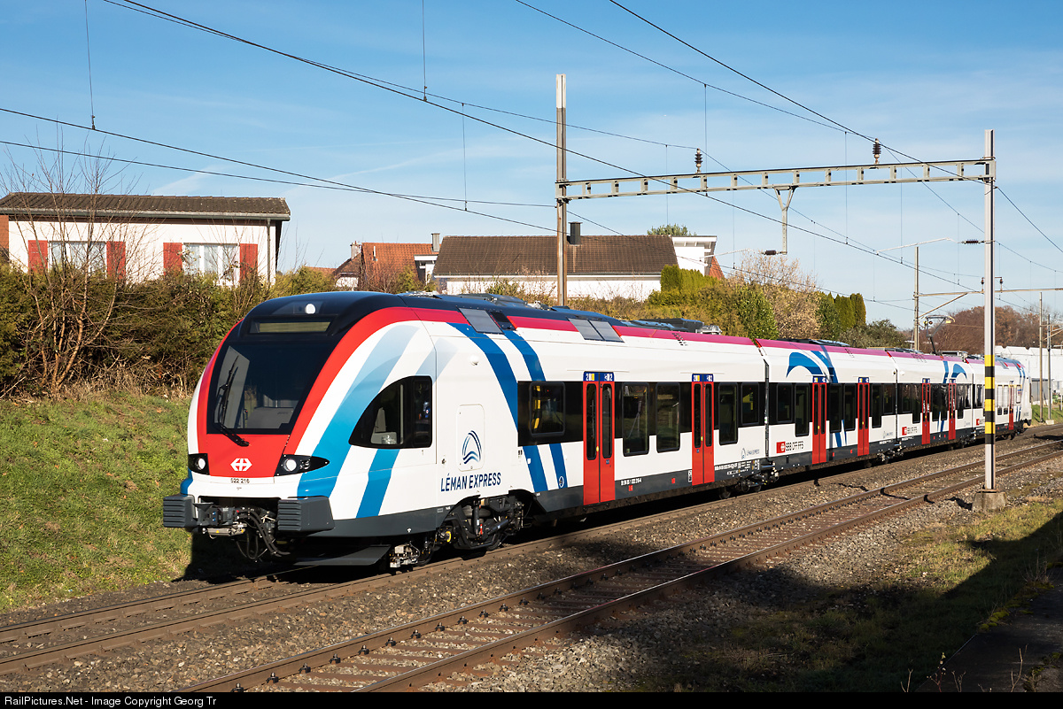 Brand new "Flirt France" RABe 522 # 216 of the SBB, built by Stadler Rail, is on a test run from Sulgen to Romanshorn, running through Erlen station. This train for 15000 V 16,7 Hz and 25000 V 50 Hz AC will run on the 230 kilometer "Léman Express" network round Geneva (CEVA), including tracks in France, with 43 stations.