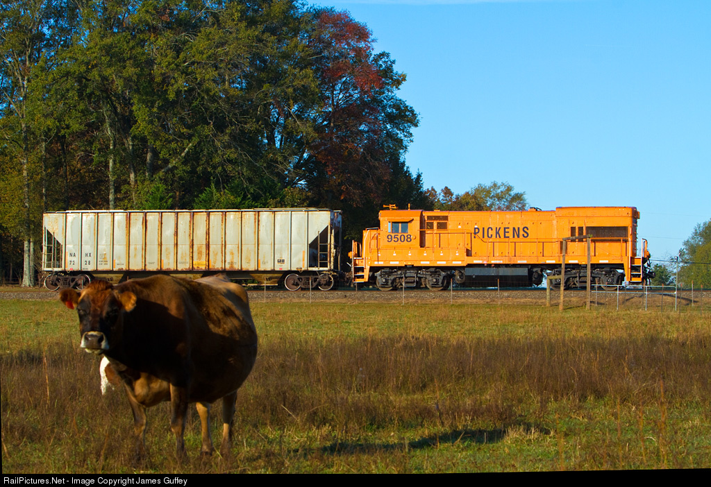 | Pickens' U18B fleet soldiers on. Here the Belton job has just started the day south of town, picked up this one hopper for NS interchange at Anderson, and trundles along at 10 mph or less. The cow is a bit perplexed at my presence. |