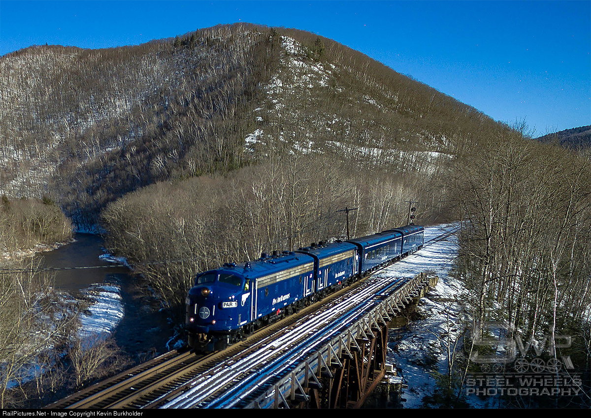 Pan Am Railway’s Office Car Special Train, symbol OCS-14, is seen heading westbound toward the Hoosac Tunnel at Florida, MA, on February 14, 2016. The train used the pair of FP9s, PAR-1 and -2 with office cars ST 100 and 101.