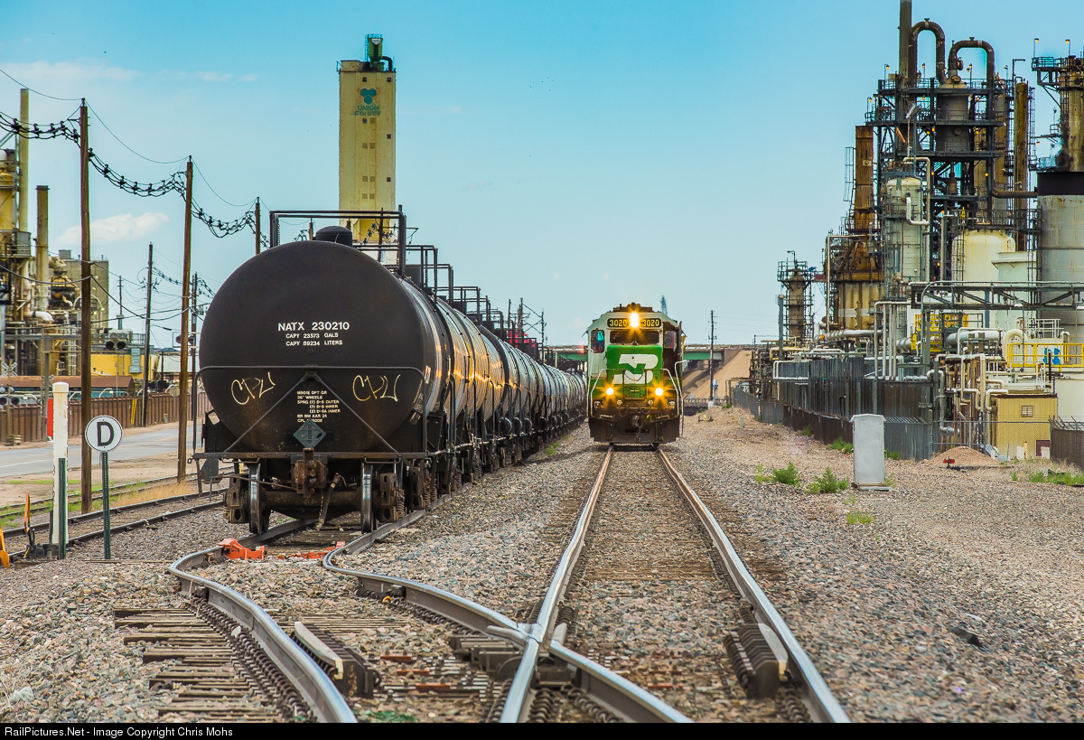 BNSF GP40M No.3020 stops on the Brush Sub Main to get ready to pull a set of cans from Suncor Energy.