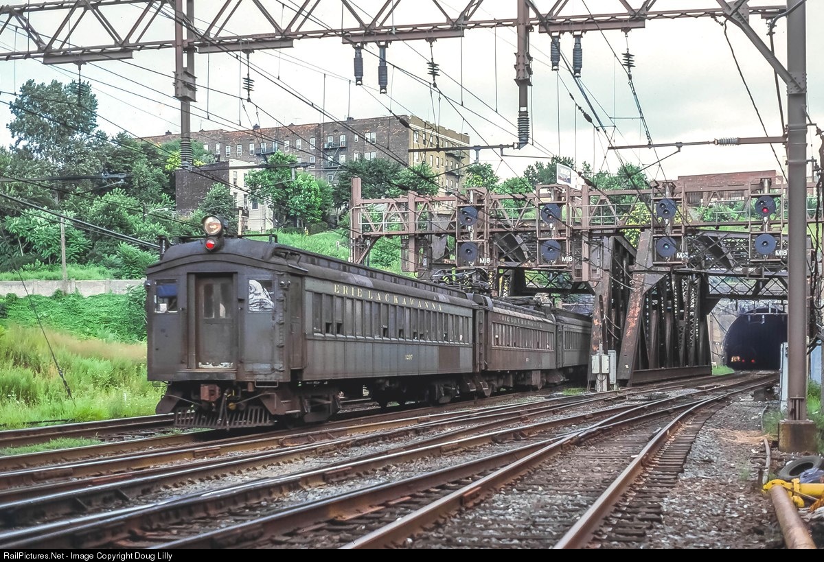 Repeating a scene that has been a daily occurrence for over a half-century, a set of former DL&W MU cars has cleared the Bergen tunnels, and will begin negotiating its path to the correct track at Hoboken terminal. After the cars were retired, many of them found homes on excursion trains. The lead car here, Erie Lackawanna 3207, is a trailer that still exists on the Boone & Scenic Valley.