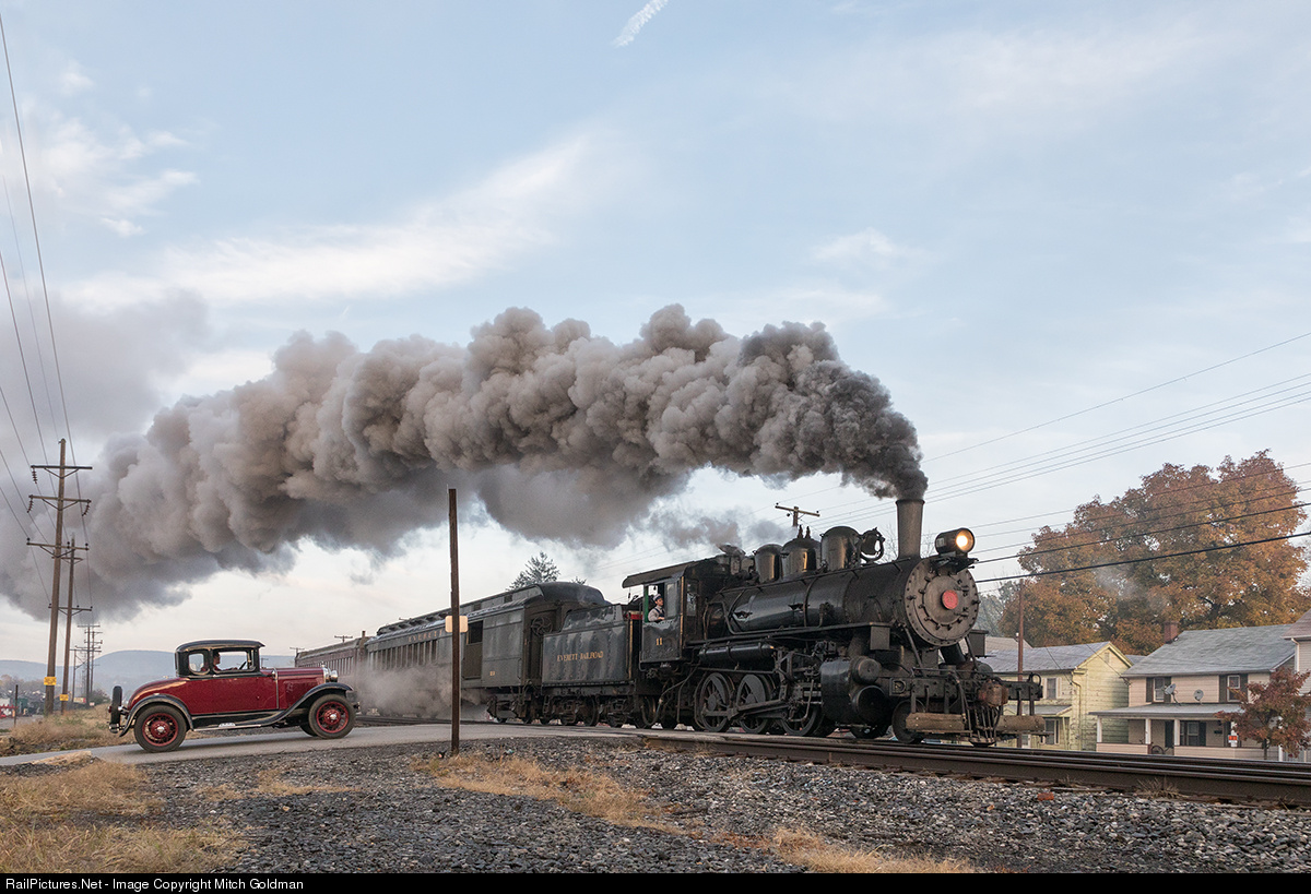 In an alternate reality, an Everett commuter train led by 2-6-0 No. 11 charges through Hollidaysburg, PA, crossing an unprotected crossing at Broad and Jackson Streets. In actuality, this line is former PRR, though it did see steam passenger trains between Altoona, PA and stations further south such as Roaring Spring, Martinsburg, and Curryville, as well as Claysburg. The original Hollidaysburg station was located just ahead of the locomotive on the side opposite the Ford Model A.