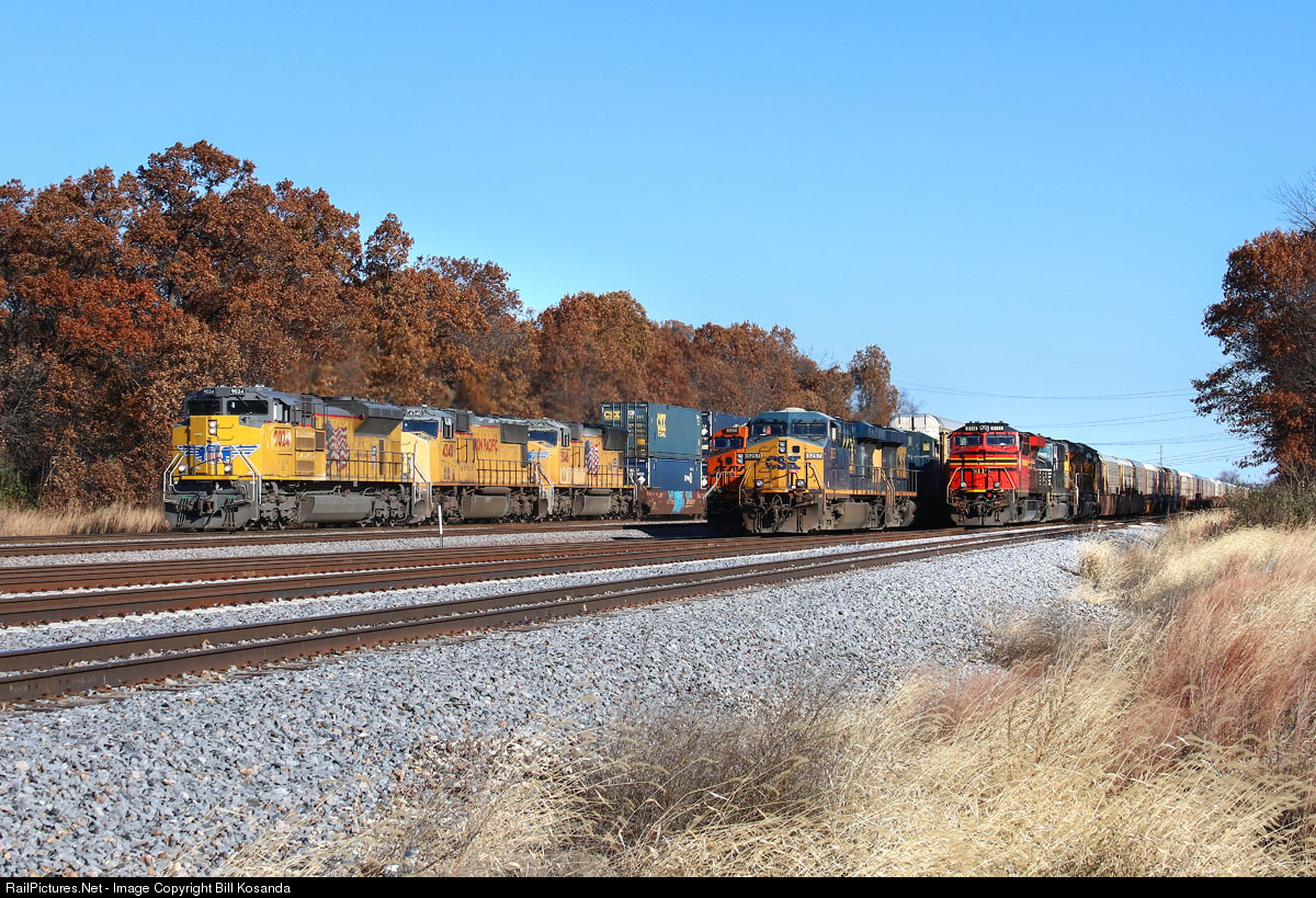 A fast UP south bounder passes three trains in the siding at Lorenzo, Illinois. This is just outside of the BNSF Logistics Park Chicago yard. Included in the trains in the siding is the NS Norfolk Southern heritage unit 8114.