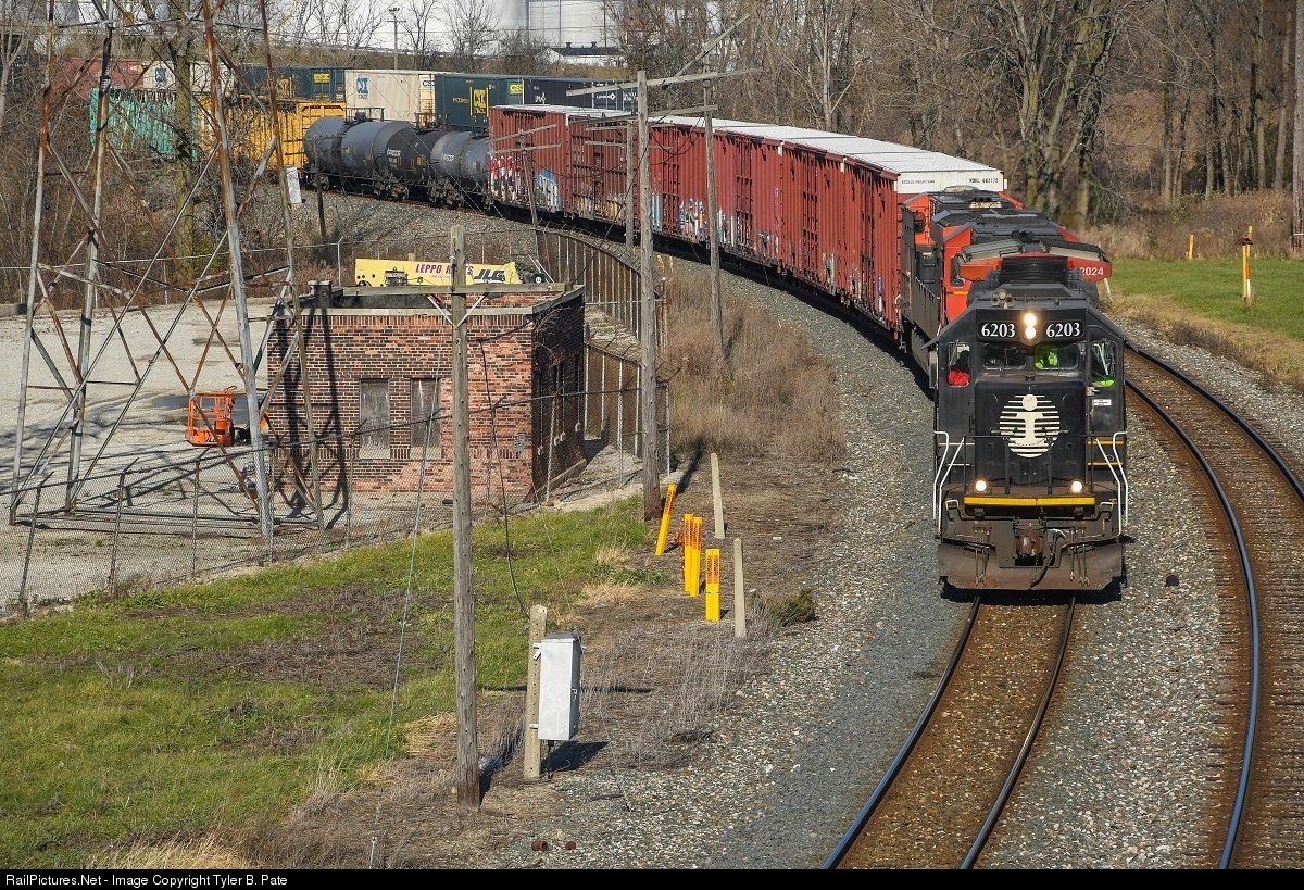 | Canadian National’s Lang Yard to Walbridge Yard transfer train runs under the CSX Symbol of Z247, is seen here on the 24th of November rolling to a stop just before the signal at Millard Ave, with an Illinois Central EMD SD40-3 No.6302 leading, followed by a pair of Canadian National General Electric widecabs. |