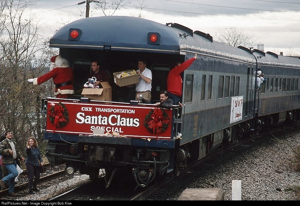 The 50th Anniversary Santa Claus Special nears the end of its run, with local citizens on the ground waiting for the train staff and Santa to heave gifts off the back platform of the business car "West Virginia." This car was built by St. Louis Car Co. in 1952 as a US Army hospital car. The celebrity guest in 1992 (not seen in this photo) was the late Mr. Joe Garagiola, Sr.; the professional ballplayer catcher, announcer, and TV host, who passed away in 2016.