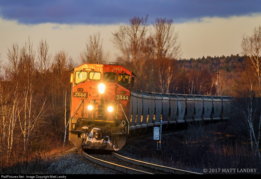 With the last bit of light, CN 2444 leads westbound train 406 as they round the bend at Rothesay, New Brunswick. Moments after the train passed, the sun dipped below the horizon for another day.