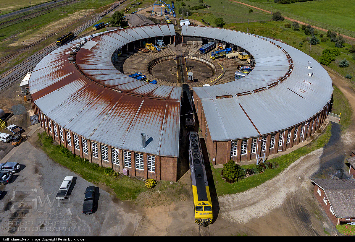 | One of three QUBE Logistics RL-class RTS Islington, South Australia-built AT36-C locomotives exits the nearly full-circle roundhouse at Junee, New South Wales, where multiple other models of Australian diesels are being worked on - largely the Alco-family type. |