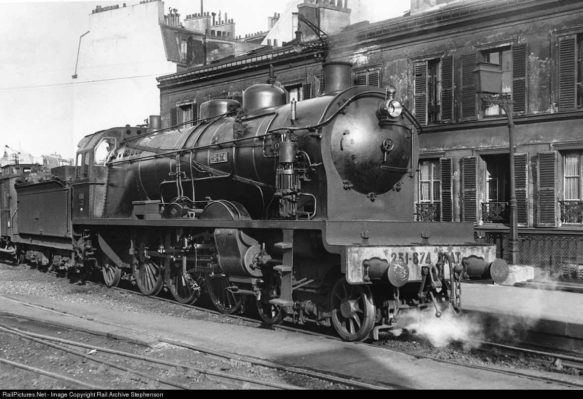| ETAT railway four-cylinder compound 4-6-2 No 231-674 at Paris Saint Lazare station in c1920. This was one of the ETAT-TP (Travaux Publics (Public Works) type Pacifics first built in 1914 and eventually totalling nearly 400 examples with 283 on the ETAT and the others spread over the AL, Est, PO and one on the Nord. This one was built by the North British Locomotive Company, Glasgow, Scotland in 1916. Photo scanned from a glass negative by an unknown photographer. |
