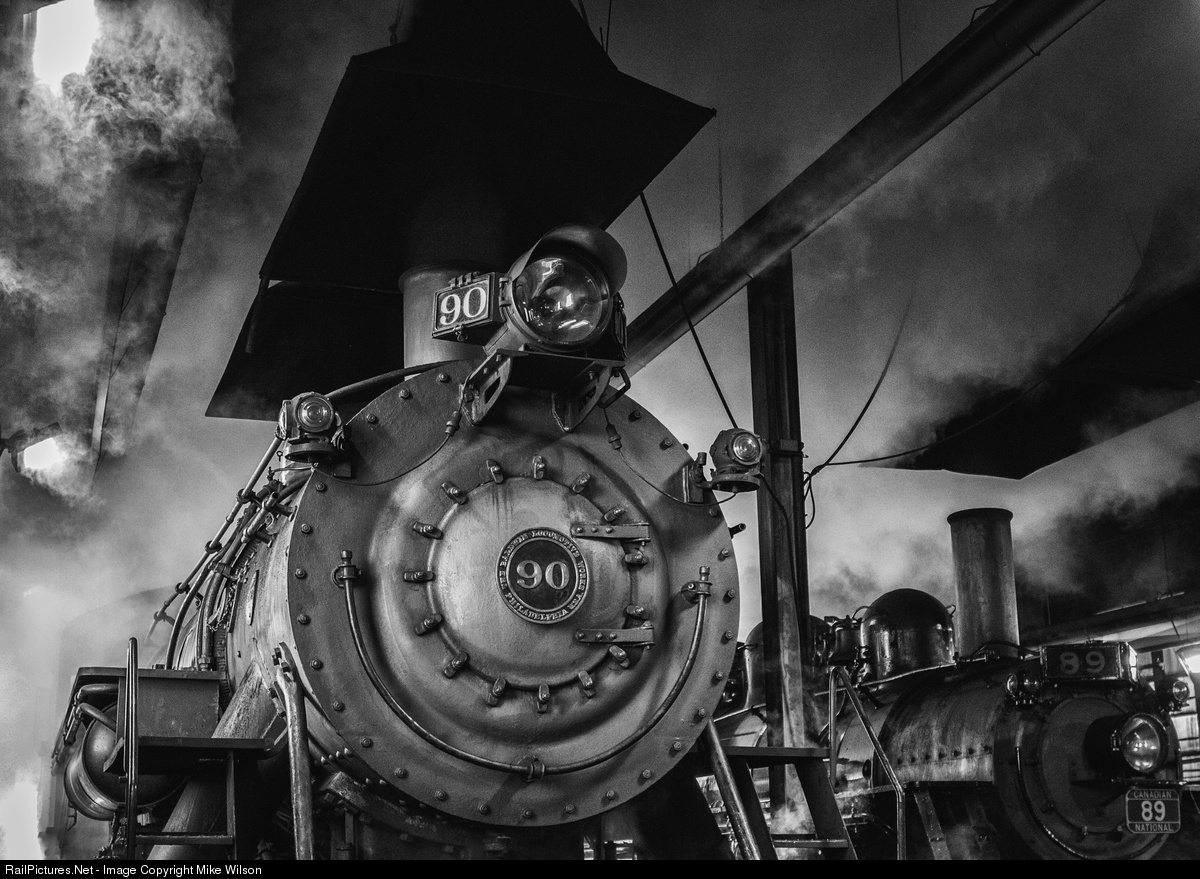 Two locomotives from a bygone era, are getting hot inside the enginehouse of the Strasburg Rail Road. Here, Canadian National #89's safety lifts enveloping Great Western decapod #90 in steam signalling the start of another day on the high iron.