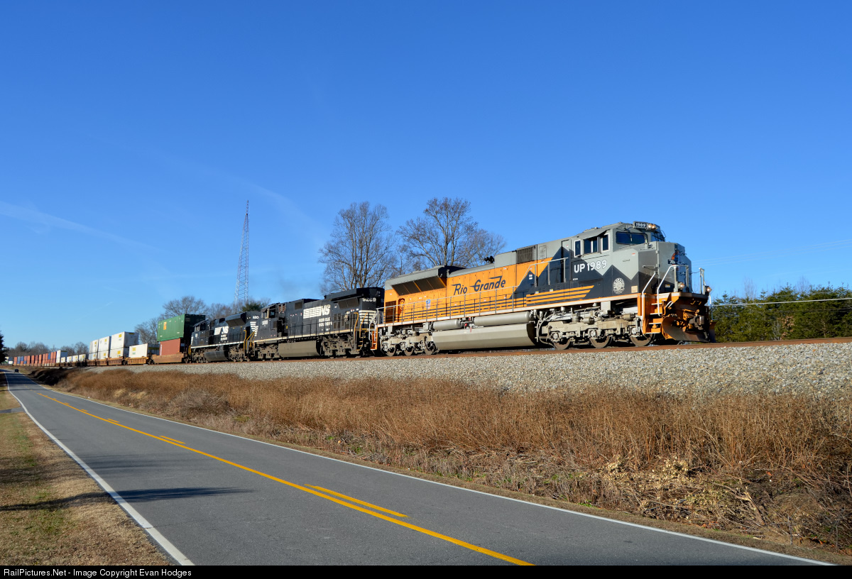| A rare sight on NS lines at least this far east as UP 1989 the Rio Grande Heritage unit passes just north of the small town of Reidsville with an intermodal train destined for Harrisburg, Pa. |