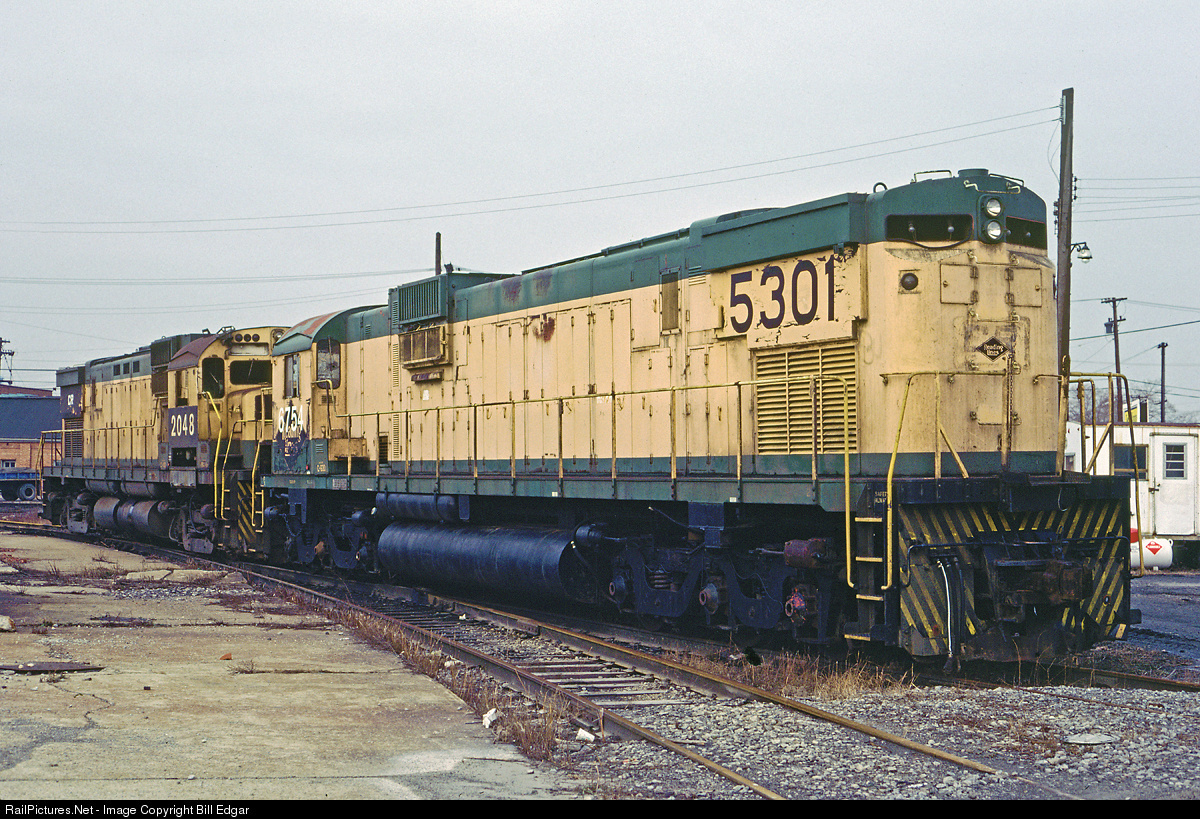 | Reading Alco C630 no. 5301 (nee CR 6754) is joined in a short deadline by C430 CR2048 at Collinwood, OH. These were inherited by Conrail when its inception included absorbing several bankrupt railroads besides Penn Central on April Fool's Day 1976. By 1981 Conrail was getting its house in order and Alco power and older GEs did not have a place in its future. |