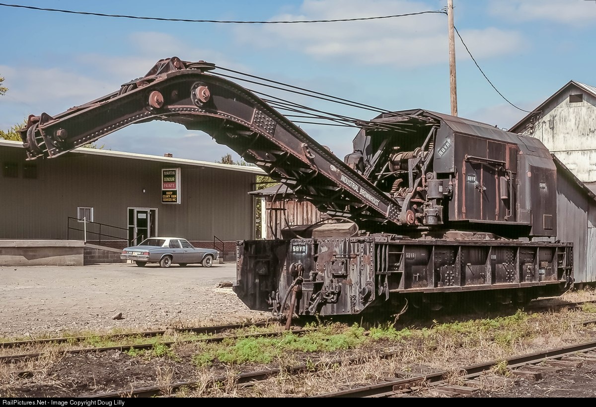 The South Branch Valley’s Industrial Brownhoist crane is seen on a siding in Moorefield, West Virginia. The ultra-heavy frame and lack of knuckle couplers strongly suggest that the wrecker came from the same military surplus source as the line’s two Alco MRS1’s. It’s interesting to think how this piece was handled in interchange service to get to the SBV at Green Spring.