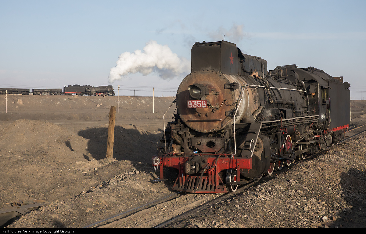 | 2-8-2 steamlocomotive JS # 8358 near the workshop of Dongbolizhan. This locomotive is used in nearby Nanzhan and for the line from there to the Erjing coal mine. In the background is JS # 8225 of the Sandaoling coal mine railroad, pushing an empty train from the washery to the open pit for loading again. |