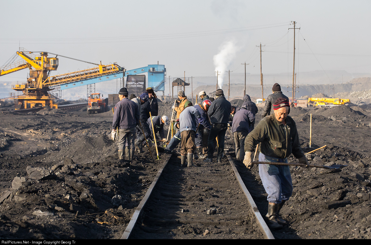 Chinese track workers in the loading area of the Sandaoling open cast coal pit.