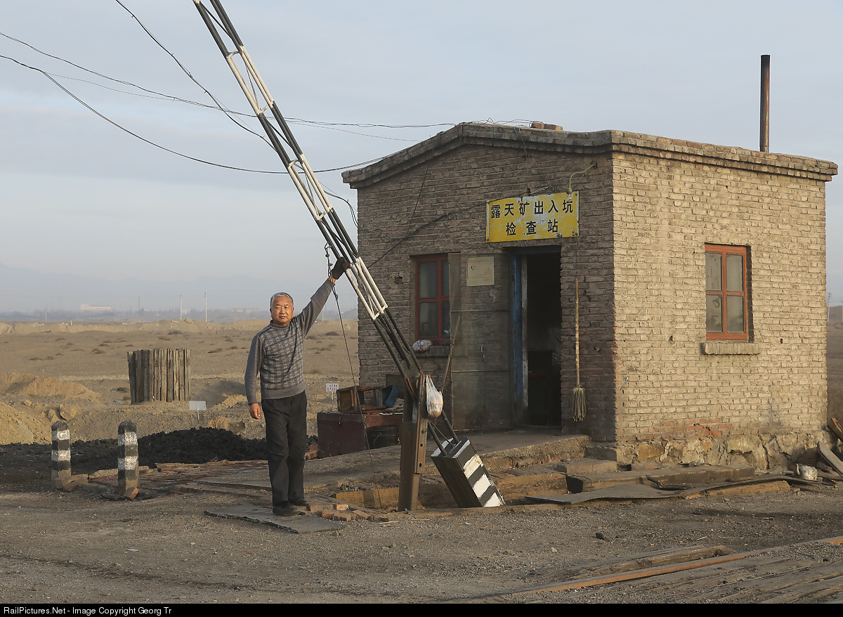 Barrier guard near Dongbolizhan station on the Sandaoling open cast pit railroad. The barrier is operated manually, the barrier on the other side of the three tracks moves simultanously via a wire connection underneath the tracks. The basic position of the barrier is closed, it is opened for the passage of road vehicles as long as there is no train movement. The crossing is a service road for the mine only.
