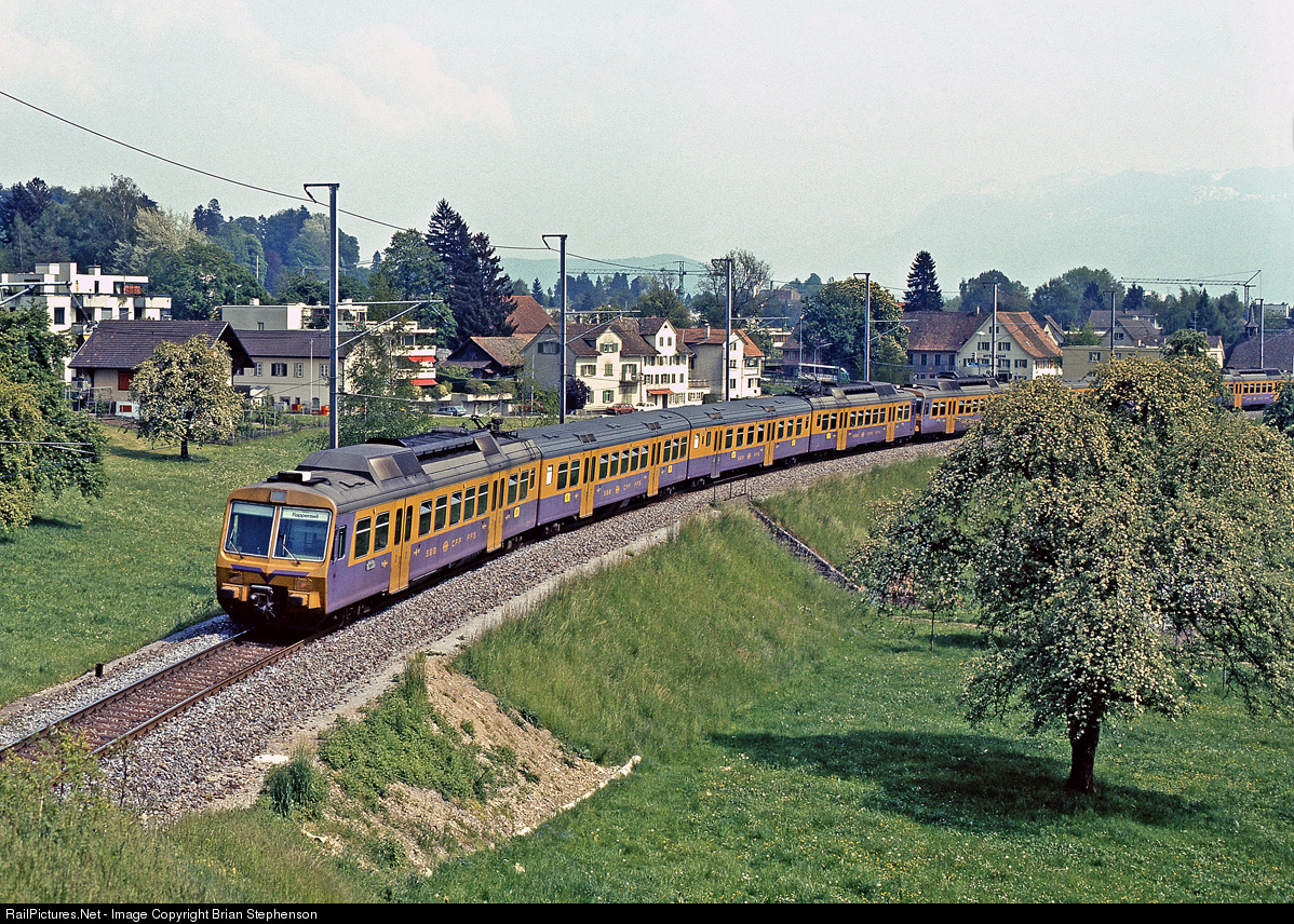Two of the four SBB prototype RABDe 8/16 EMUs head away from Kempraten towards the end of their journey from Zurich to Rapperswil. These four-car lightweight units built in 1976, with the nickname 'Chiquitas', did not prove very successful and have been scrapped many years ago.
