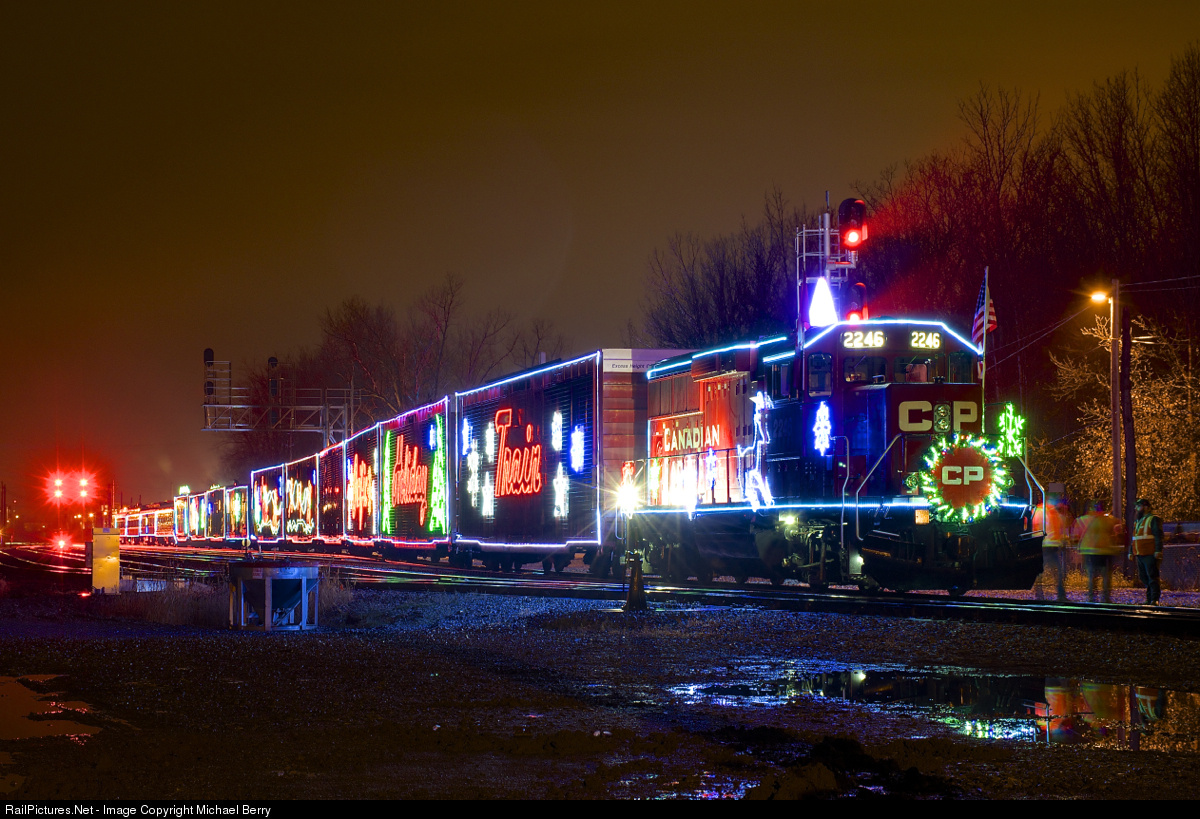 The U.S. version of CP's Holiday train is stopped at Delson as it makes its third stop of the night, with CP 2246 for power.