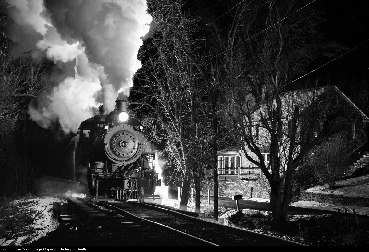 New Hope & Ivyland No. 40 leads a Santa train through Hood on a chilly evening following a snowfall. This bridge is frequently photographed from the other side of the tracks. Lights were carefully placed to avoid the trees. Focusing light on the nose of the locomotive and the stone house creates depth in the photo.