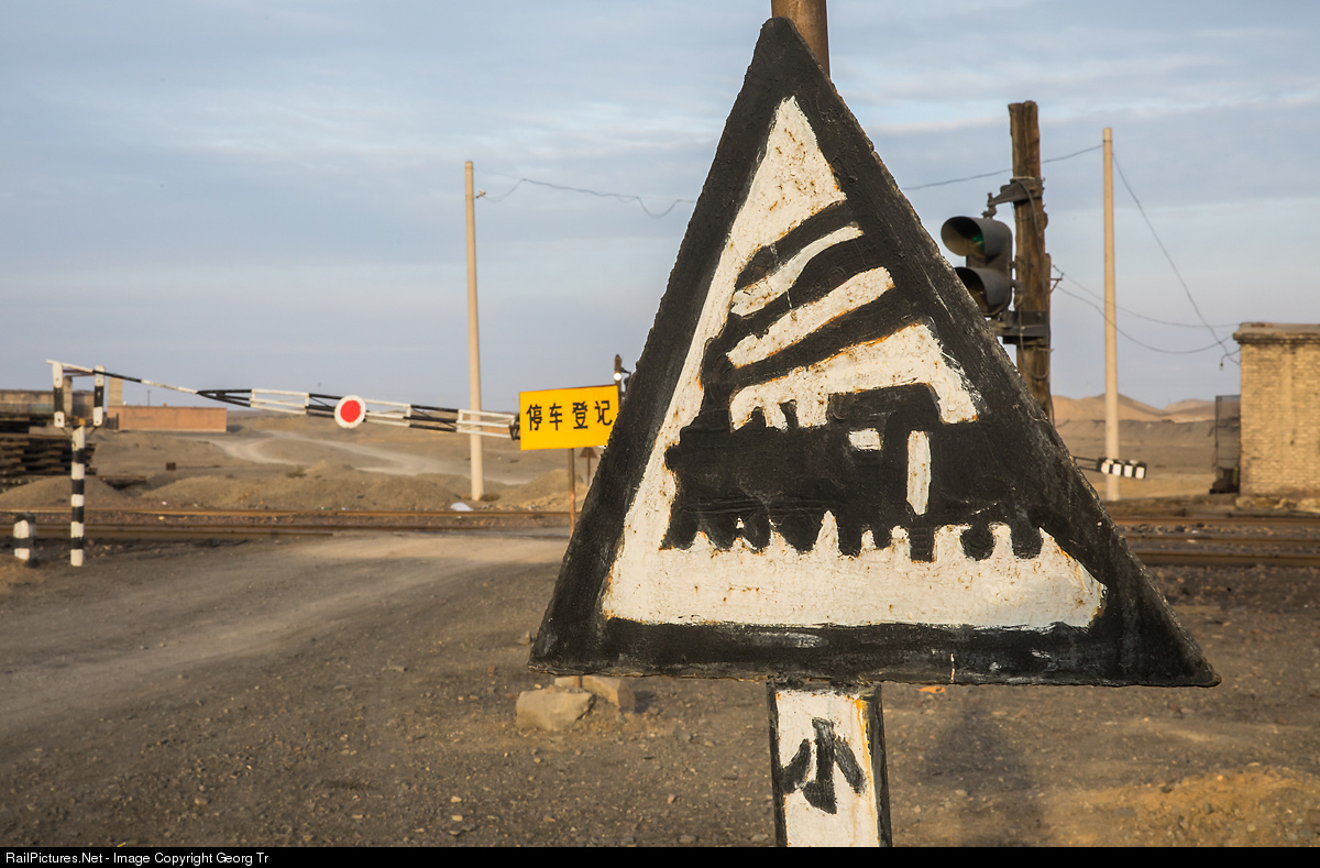 Attention, steamtrain from the right! Hand-painted traffic sign at the railway crossing near Dongbolizhan.