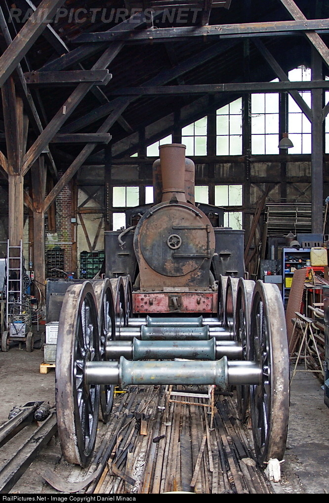 View of the small preserved steam 030 under the roundhouse of Ajecta association, the wheels in front of picture are middle wheels of 140 C 231 who is being restored, Steam 140 C 231 that firebox, smoke box and boiler was withdrawn to be restored in Poland.