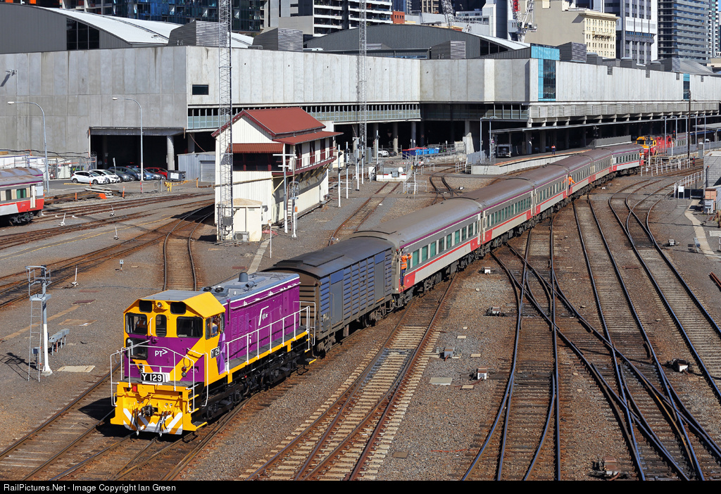 | Recently overhauled and repainted in the new PTV livery, yard pilot Y129 shunts a car set towards the platforms at Southern Cross Station. |