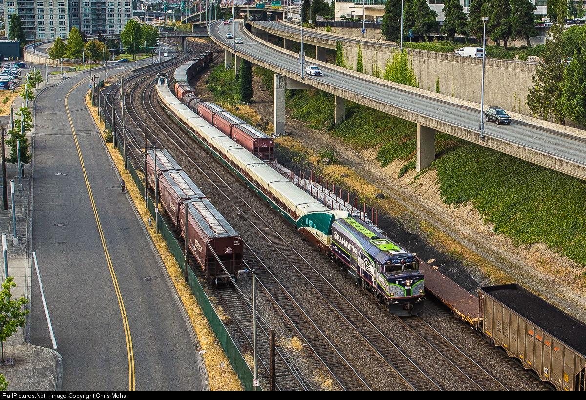 | The Seahawks cabbage, Ex F40PH rolls southbound along the Tacoma Waterfront. The city is just coming alive at this early morning hour. |