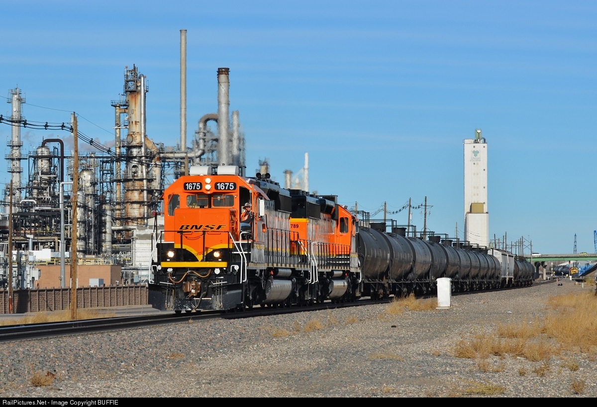 | BNSF 1675, a former Burlington Northern SD40-2, gets ready to shove a cut of oil cans into one of the refineries in Commerce City, Colorado. |