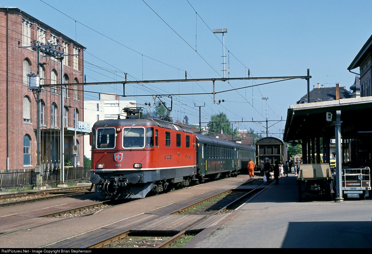 | One of the final series of SBB Re 4/4 II locos that now mainly work in Germany, No 11383 (now SBB Cargo Re 421 383 but currently on hire to the SBB passenger division), arrives at Arbon with a Romanshorn to Rorschach train. |
