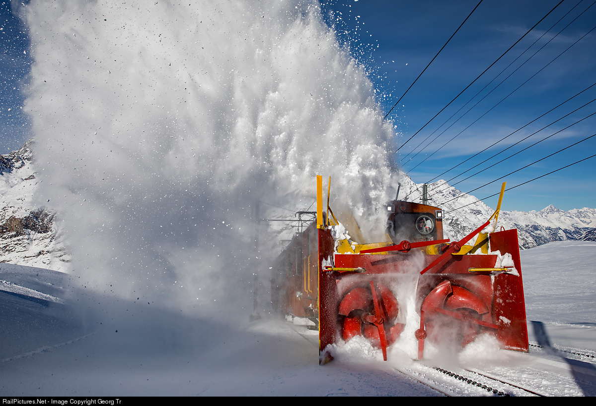 The track will be clear for 2018! Snow blower X rote # 3932, shoved by railcar Bhe 4/4 # 3062, is clearing the track of the Gornergrat Bahn ("the Matterhorn Railway") from Riffelberg to the Gornergrat.