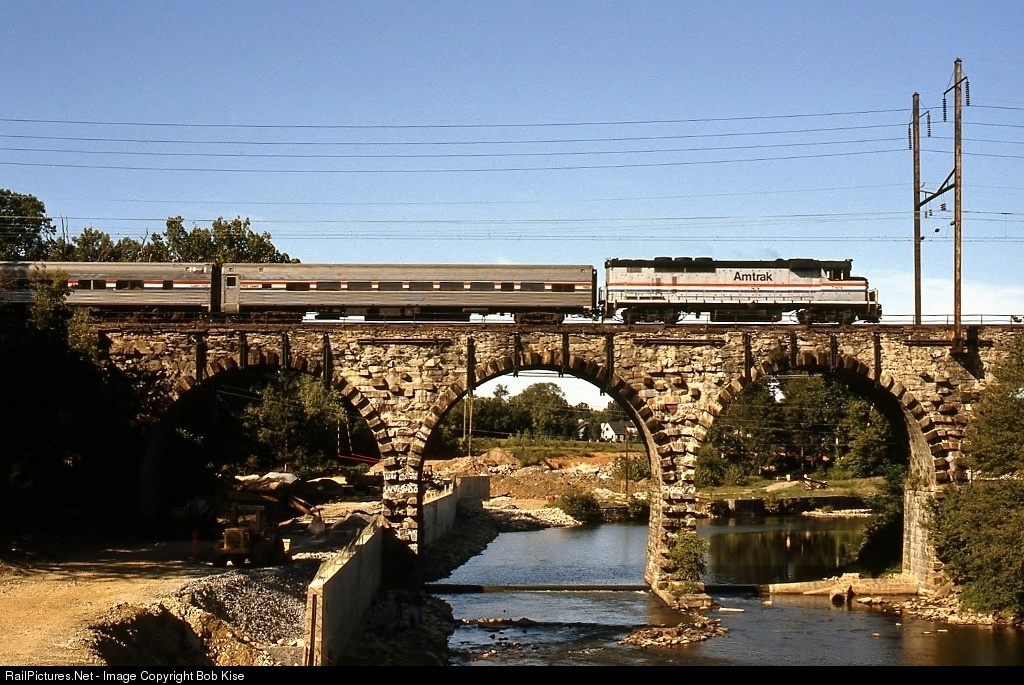 GMD-built No. 199 is seen here in early-90s Keystone Service, crossing the old PRR arch bridge east of Lancaster. This unit was built in the mid-60s for Toronto's GO Transit, sold to Amtrak in 1988, and was rebuilt by Altoona in 2004 as a GP38H-3, renumbered to "AMTK 507."