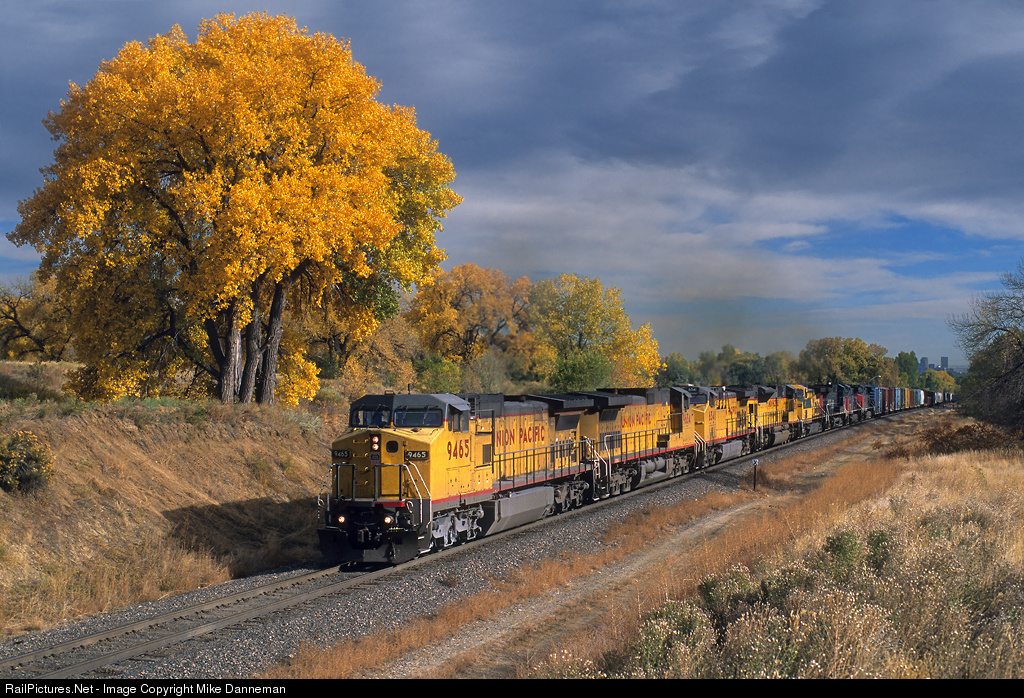 Union Pacific MDVRO heads west through Arvada, Colorado, on October 19, 2001. GE C41-8W No. 9465 leads a UP Dash 9, an AC4400CW and an EMD SD9043MAC. Rounding off the 8-locomotive consist are four more AC4400CWs—one Chicago & North Western and three from Southern Pacific. The downtown Denver skyline can be seen in the far background above the train.