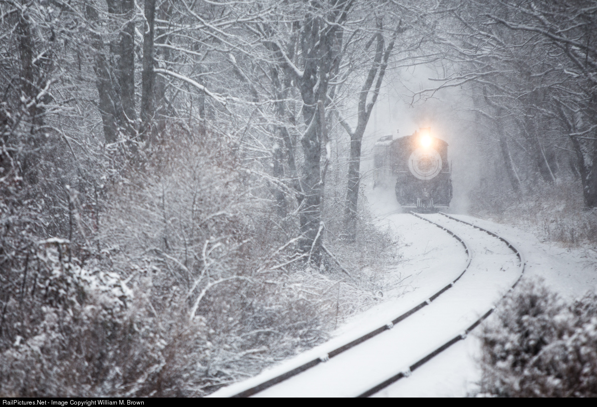 In a picturesque winter scene, pulled straight from the Polar Express book, Black River's #60 pulls a Christmas Train through the snowy forest during the first snow of the season.