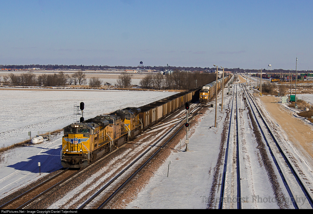 As a westbound manifest waits for a parade of westbound to clear ahead, a westbound coal empty proceeds to get another load of coal. With track maintenance everywhere on the line due to the frigid cold temperatures, it was often times for many trains a waiting game. On main one, a manifest sits and waits for several trains to pass by before being able to cross over at CP Ashton to get around maintenance working between CP Ashton and CP NQ (Nelson, IL). Many trains would spend time waiting at restricted signals due to this process. Ironically, waiting seemed to be the name for both railroads in the area as the BNSF had two trains tied down on the double main between Steward, IL and Flagg Center, IL. The first was tied down at the signal in Steward, IL and the second was tied down in the background of this photo at the signals just before the diamond in town. The second unit on the tied down BNSF in the photo is a BNSF SD70MAC. / Train: UP CWFNA9 03 / Westbound Coal Empty from NIPSCO Schafer Generating Station - Wheatfield, IN (NS) to North Antelope Rojo Mine - Wright, WY (BNSF)