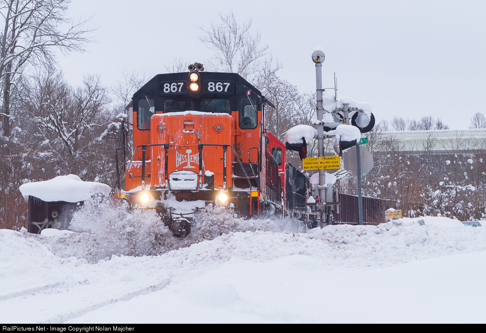 Lake effect snow has hammered Northeast Ohio and Northwest Pennsylvania throughout the past few weeks, but that hasn't stopped ore from moving on the former Bessemer & Lake Erie railroad. Here, BLE SD38AC No. 867 plows through a snow bank at the Old Main Street grade crossing in Conneaut, Ohio with a train of empties for the harbor.