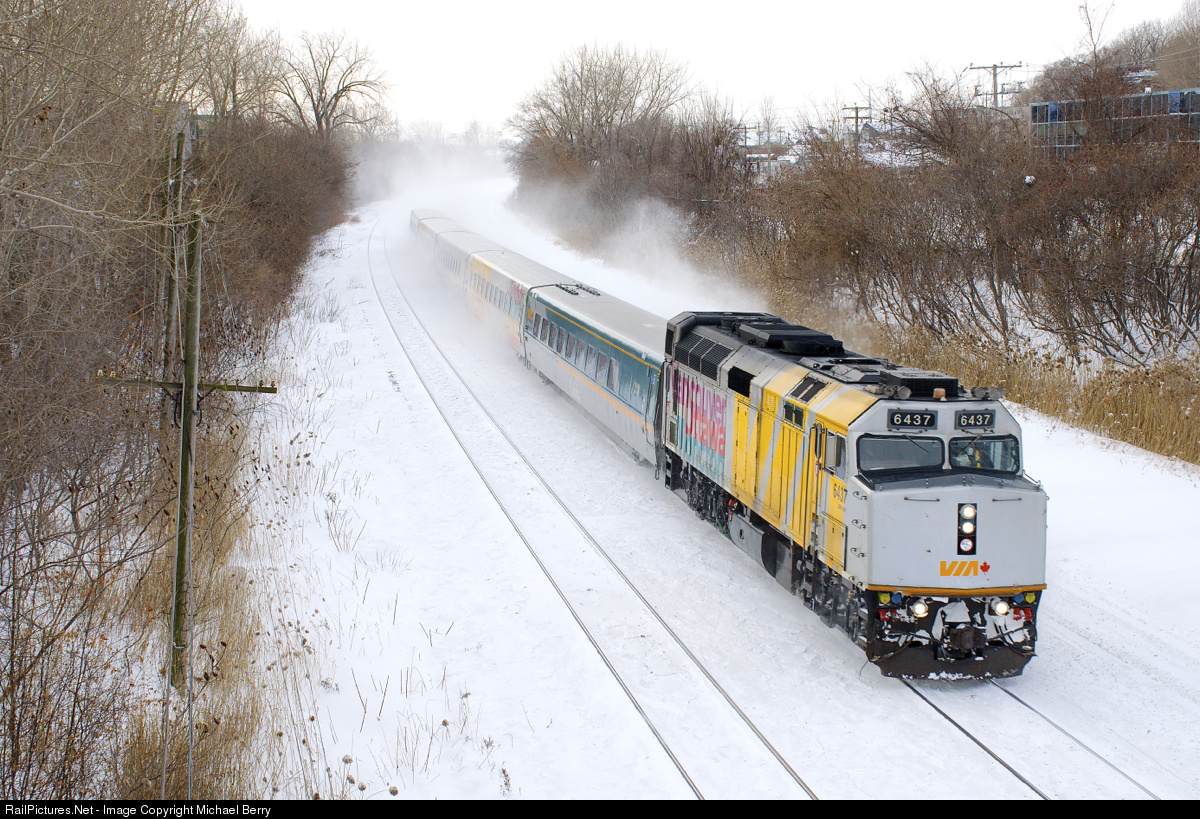 Gone from this one. VIA Rail has started to remove 'Canada 150' markings from rolling stock, as has happened with VIA 6437 (one of five F40's to feature a Canada 150 wrap). It is seen here leading VIA 62, kicking up the snow with five LRC coaches in tow.