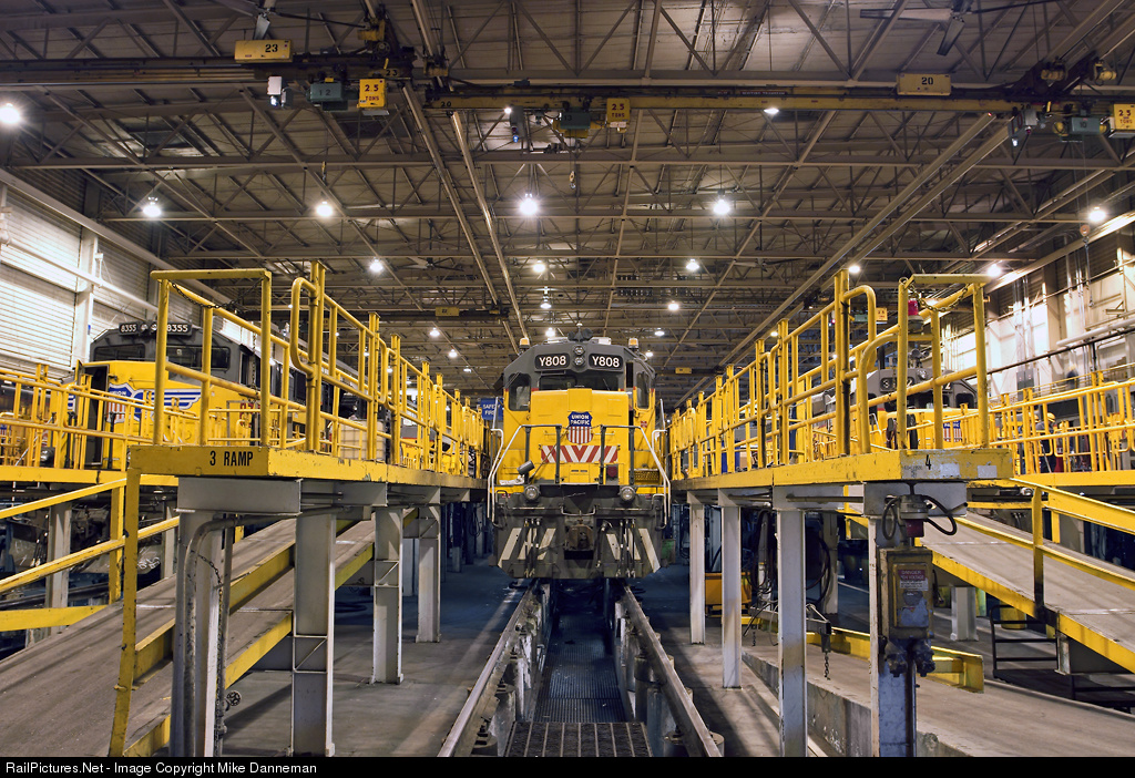 Union Pacific EMD SD38-2 No. Y808 sits in railroad’s huge diesel shop at North Platte, Nebraska, on May 4, 2011. The locomotive is former Chicago & North Western No. 6652, and at the time, assigned to hump duty at North Platte.
