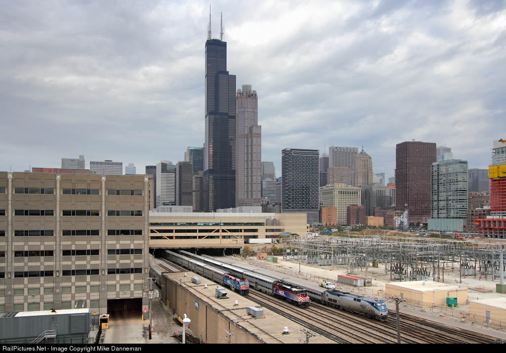 A pair of Metra commuter trains approaches Chicago Union Station, along with an Amtrak train slowly backing into the station on November 9, 2017. Chicago’s dynamic skyline dominates the background, centered around the 110-floor Willis Tower, built as and still commonly referred to as the Sears Tower.