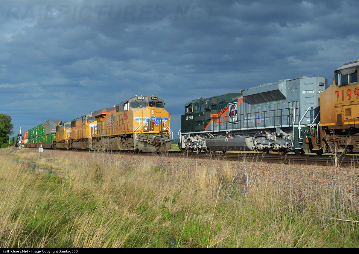 | Union Pacific's Western Pacific heritage unit sits without a crew at the end of siding in Arlington. This train was originally scheduled to take the Omaha Subdivision, but due to a collision between a vehicle and a local train earlier that day, the train was rereouted onto the Blair Sub where it sat for more than 7 hours before being recrewed. |