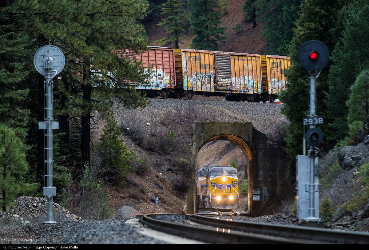 The thunder rolls. On a cold stormy day in Northern California, Union Pacific 6662 guides a heavy MNPRVX around the Williams Loop, east of Quincy. At over 7,000' in length, this train easily has the size to loop back over itself. Guarding this iconic piece of railroad engineering are two classic searchlight signals.