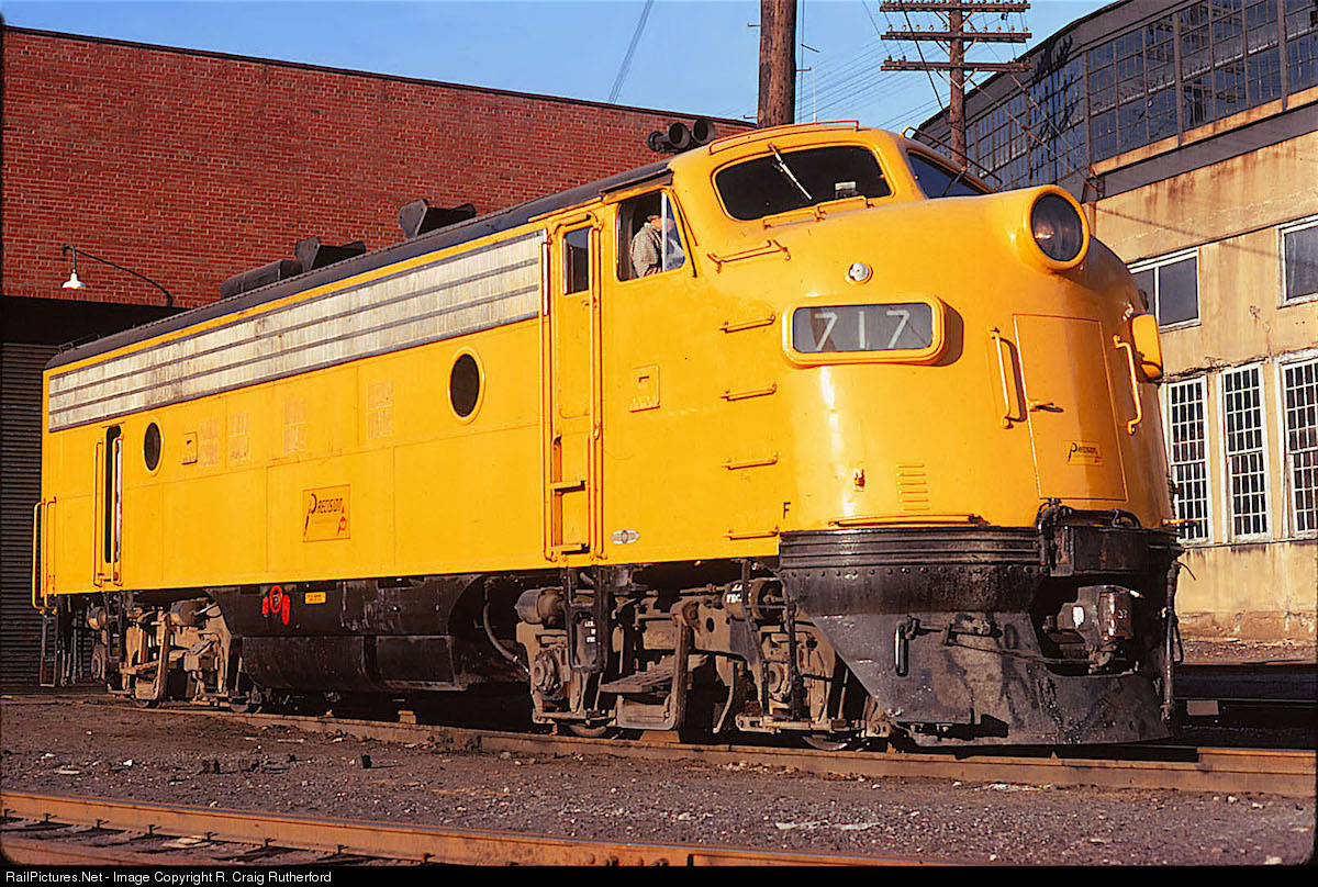 Precision National Corporation was a pioneer in the locomotive leasing field. It’s lease fleet was built almost exclusively on locomotives powered by EMD 567 engines. One such example was a dozen F7As and F7Bs acquired in 1970 from Bessemer & Lake Erie. Coincidently, PNC F7A #717 (ex-B&LE of the same number) was photographed at the B&LE’s Greenville facilities in the Spring of 1971. We asked if they could pull cab unit out of the diesel shop, and here was the result.